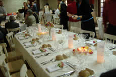 披露宴は午後6時から始まる予定だったのだが、お天気が良かったので、5時頃にはかなりのお客さまが見えて、庭でギヨムのお父さんのレセピーで注文して作ってもらったカクテルなどを飲み始めた。ギヨムの従兄の親子が終始ノルマンディー古来の楽器である、バグパイプとボンバルト(クラリネットに似ている)を演奏してくれたのが、とても素敵だった。8時半頃に建物に入ると、メイン・テーブルに新郎新婦、その両親、4人の証人が座った。日本で花嫁、花婿の両親が最下位に座るのとは、大きな違いだった。